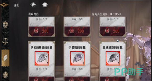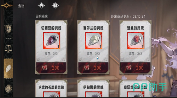 玩家可以进入到回响商店,这其实就是获取灵魄的重要途径。在进入到这里之后,可以看到有很多不一样的灵魄,例如有切尔西的灵魄,还会有吉尔兰的灵魄。每一种售价都是一样的,全部都是200个回响币,目前的库存也比较丰富。不过玩家随时都应该关注商店的刷新,在积攒足够的货币之后,就可以兑换自己所喜欢角色的灵魄,可以给后期的养成奠定更多的基础。