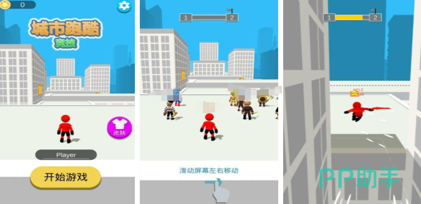 城市跑酷竞技,是一个趣味性非常强的跑酷类手游,游戏里玩家扮演的是一个比较简单的火柴人形象,需要操控这个角色不断在高楼大厦中跳跃,除了玩家之外还会有很多其他的成员,要不断和他们竞技,这样才能率先到达终点,从而成为游戏里的冠军,游戏里的操作非常简单,角色会自动奔跑,玩家只需要操控角色左右移动或者跳跃即可。