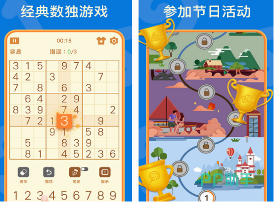 在这款以经典的数独拼图,为主要玩法的益智游戏中,会显示3×3的正方形方格,无论是在小范围内还是比较大的范围内,都需要将1~9个数字顺利的完成填写。如果能在每行每列中,不会有重复的情况下,才可顺利的进入其他的关卡当中,进行挑战。对于孩子来说,既可根据需求选择不同的难度,也可根据完成的时间,来看看自己在脑力,这方面所具备的实力。