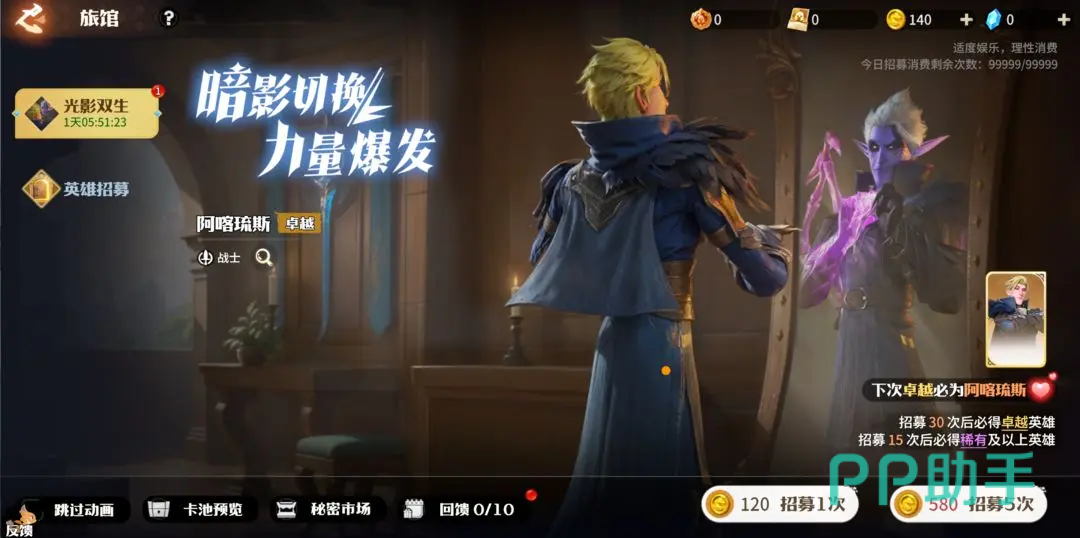 主动技能“裁决之剑”,对最近的一名敌方单位造成攻击力300%的伤害,变身为黑暗骑士期间,该技能的寻敌半径提升到7格,并在释放时瞬移到目标身边,基础伤害很高的招式,附带途径效果,突破之后,变身期间的血量越低,伤害就越高,能连续释放,用来残血收割非常不错。