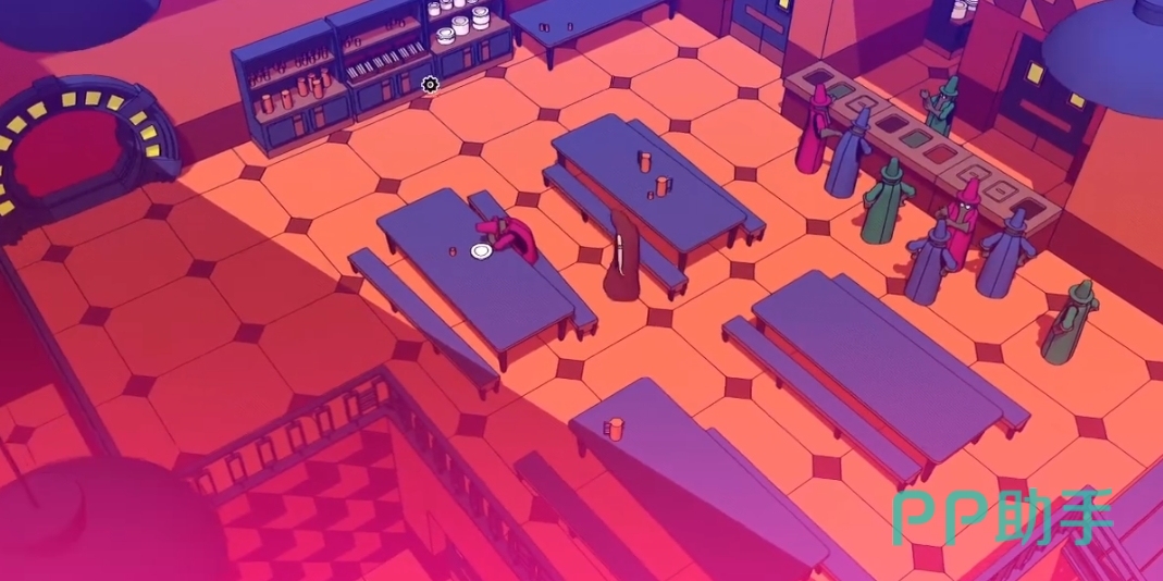 8、选择走楼梯继续往上前进知道高塔的顶楼,顶楼是餐厅。等待铃声响后进入用餐,结束用餐后从左边的门出去,来到新的场景。根据地面图案获得解谜线索。