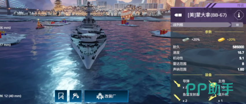 其主炮火力虽不如黎塞留猛,但胜在装填极快,四座三联装406mm主炮12秒一轮,辅以六座副炮持续打击,总伤害稳定且节奏紧凑。她的防空系统更是灵活多样,萨德系统、自由防空与高频自动炮的组合能构建出立体反导屏障,对抗战机与导弹均有不错表现。需要注意的是,蒙大拿舰体庞大、机动性低,容易在转场或撤退时被敌方集火。主炮布局为前二后二,也导致架点作战时经常出现部分炮塔被掩体遮挡的问题。更遗憾的是,其反潜能力薄弱,仅靠鱼雷难以对潜艇形成有效压制。