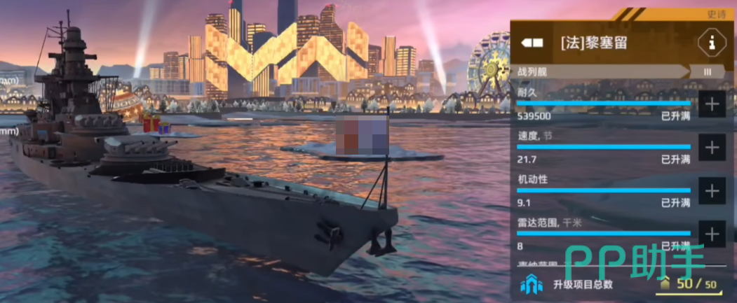 这艘战舰以"全能暴力美学"著称,配备四座火箭炮、两座四联装主炮以及三座副炮,具备超强的瞬间打击能力。全弹齐射10秒内打出30万强制伤害,攻势极为凶猛。而与其爆发火力同样惊人的,是她独特的高机动性,24节极速加上优良的转向性能,让她在战列舰中具备远超常规的生存与追击能力。再加上优秀的防空能力,使其在打击航母和潜艇时也具备极高效率。然而,新版本中黎塞留迎来削弱,主炮暴击率与机动性下调,失去了对抗导弹机的能力。在缺乏宙斯盾系统和电子对抗配置的情况下,其防空与抗压能力被其他战列舰如武藏、宙斯盾大和等超越。但瑕不掩瑜,黎塞留依然是一艘下限高、上限偏低的战舰,适合手法一般的玩家。