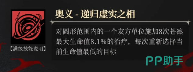 递归虚实之相:这是一个奥义技能,当战斗在进入到白热化的阶段时就可以使用。在使用时角色的身上就会散发一种柔和的光芒,以角色作为中心,形成一个治疗区域,在这一个领域内,每一个友方单位全部都会受到技能影响。这一个技能还会连续的施加8次治疗,每次全部都可以精准的找到一些生命值相对比较低的有方单位。