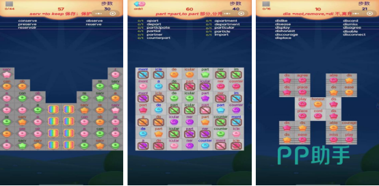 将英语的元素以及三消的玩法结合在一起,玩家将会沉浸在色彩缤纷的游戏世界当中,通过仔细观察的方式,将不同颜色的英语字母或者是带有不同英文单词的图片放在一起,就能快速消除每个关卡中所呈现出来的目标要求是完全不同的。当完成了目标任务之后就可提升自己的英语水平。其中还提供了很多独特的道具,比如爆炸字母以及换位符号等等。