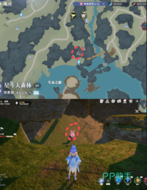第1个位置是在星斗大森林的左上区域,大概是靠近星斗谷地这边。这里就会处于一个山地地形周围还会有山体围绕,地图显示探索度为42.1%。在前方的位置,大家就能看到有一个粉色的兔子形状,接近之后就可以直接收集。