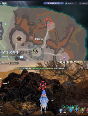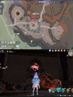 第2个位置是在星斗大森林的右上位置,就好像是身处于火山岩的地貌环境,这里就会有很多的岩石堆积。回忆的标识在角色的头顶这边周围会有一些特殊的颜色。