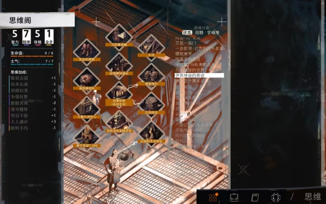 开展任何思维阁任务研究,都无可避免地要消耗时间,游戏中的时间设定极为关键,从清晨到深夜,时间的流逝影响着NPC的活动规律、事件的触发时机,而当主角进入睡眠状态时,思维阁研究进程会暂时停滞,这就意味着玩家需合理规划游戏时间,巧妙利用白天的探索间隙,推进思维研究,玩家在游戏进程中获得的技能点,除了用于提升常规的24种技能外,还可投入到思维阁系统,一方面消耗技能点能解锁更多思维阁槽位,使玩家得以同时进行多个思维研究,加快思维体系的完善,另一方面若玩家在研究过程中改变主意,或是发现某项思维与当前游戏策略相悖,可花费技能点抹除该思维,重新调整研究方向。