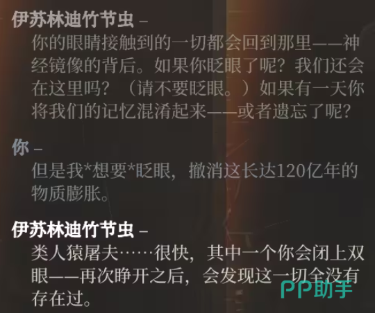 如果玩家在游戏过程中留意密码动物学家寻找稀有大竹节虫的支线任务,且主角在内陆帝国技能上投入足够点数,在最终找到凶手的小岛上,将有机会与神秘的竹节虫对话。竹节虫解释了其存在的目的与世界观,暗示它可能通过释放激素影响了逃兵的心智,促使其犯罪,竹节虫认为人类最终将因灰域斗争走向消亡,这可以看作是竹节虫对全人类的一种无形审判。