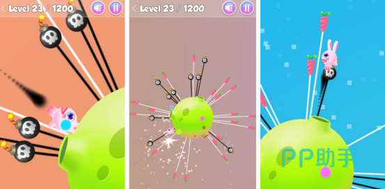 简单易上手的操作方式,也是围绕着兔兔和胡萝卜展开的故事情节,这款游戏看似玩法特别简单,但是对于更多的玩家来说有一定的挑战性,因为在开局之后就会看到一个不断旋转的球球,在这一个球球当中会隐藏大量的胡萝卜,但是也有很多炸弹,玩家要操控其中的兔子在球球上不断跳跃。直接跨过炸弹成功吃掉胡萝卜就能完成闯关,但是一旦碰到炸弹之后就会被炸死。