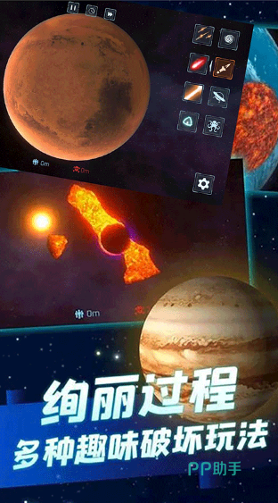 玩家扮演一名宇宙操控者,在浩瀚星系中自由选择目标星球,通过释放龙卷风、核弹、黑洞、外星怪兽等超现实灾害,感受建筑崩塌与星球解体的震撼过程。科技高度发达的未来宇宙,各星球拥有独特生态与防御系统,玩家需结合物理规律调整灾害强度与路径,例如利用陨石撞击触发连锁反应,或召唤机械巨兽精准摧毁核心建筑。玩家可组合灾害形成核爆引发海啸的复合攻击,或通过建造防护设施挑战守护模式。