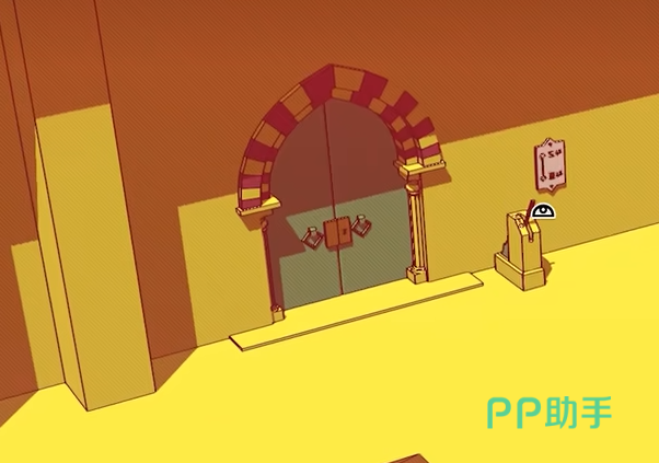 之后玩家们一路跟着楼梯往上走。在走到尽头可以看到有一扇绿色的门,这里墙上会有一段文字,这个游戏里面文字是解谜的核心内容,所以我们需要注意,这里结合摇杆可以得到墙上的文字的信息,之后操作摇杆走进门去。