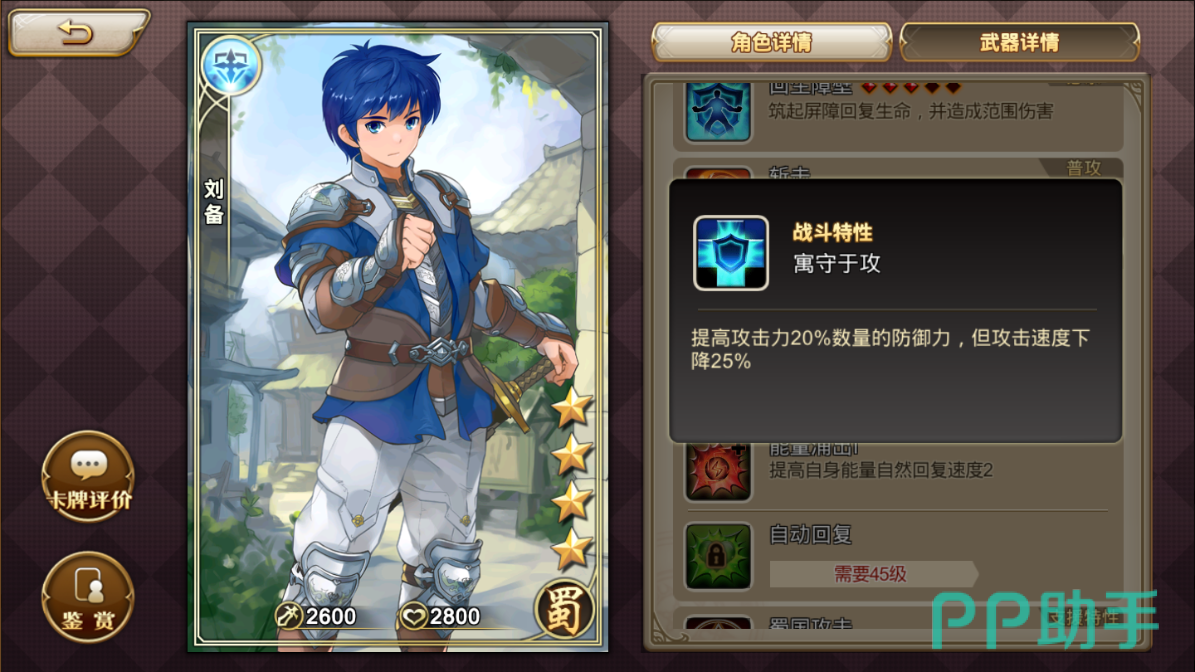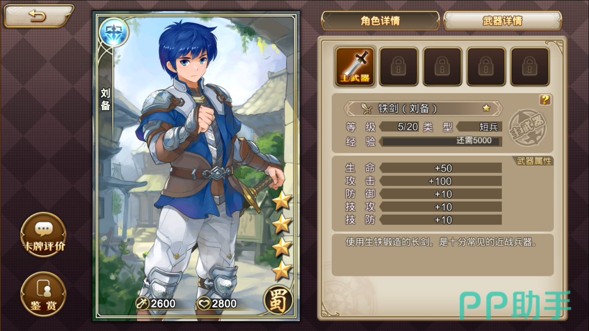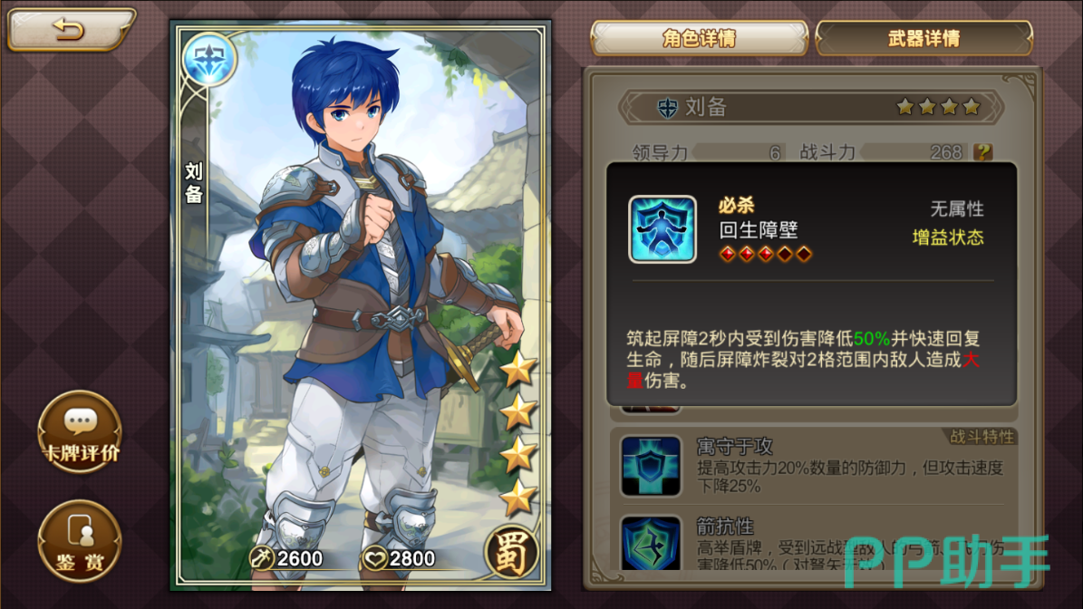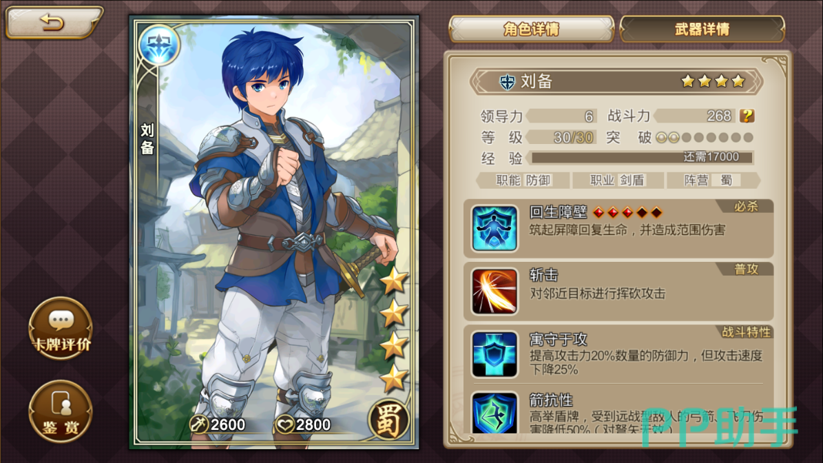 3、防御能力五颗星:刘备实用性非常大,任何副本都能使用,前期练他是不亏的。