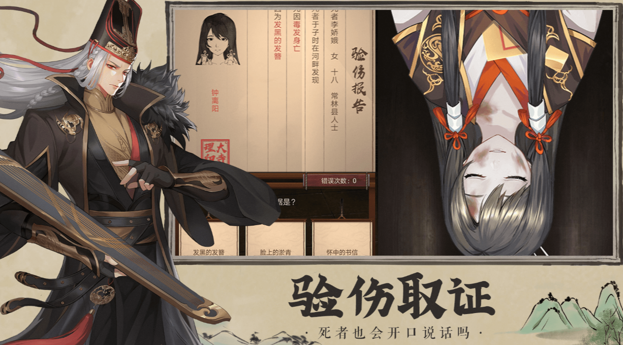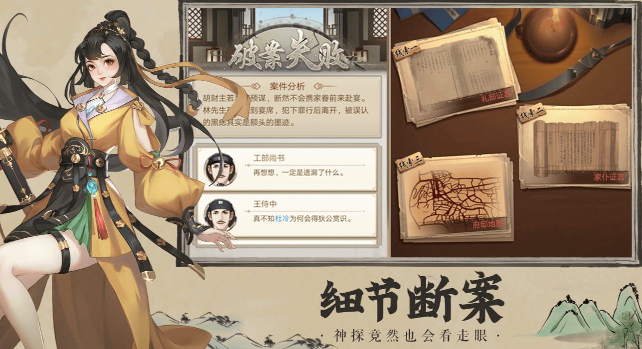 游戏的探案过程,严格参考了古代衙门的探案方式,玩家需要通过搜查证据,查看证词、推理分析,再到判案,以及确定元凶,当然,如果玩家在探案的期间,感觉到分析线索有略微的难度,也可以通过交互其他NPC的方式,来获得一定的提醒。