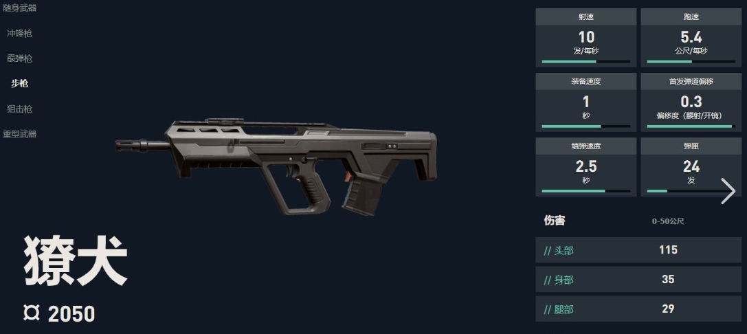 伤害方面,在0-50公尺的距离内,击中头部可造成115点伤害,击中身体有35点伤害,腿部则为29点伤害,这样的伤害数值使得獠犬在中近距离的战斗中具备足够的杀伤力,而其辅助攻击采用开镜瞄准效果,并且在射击时还会进行后坐力缓冲,此时的射击模式为3连发。