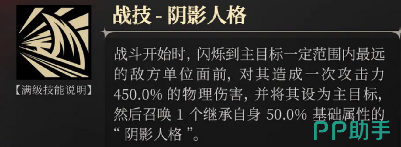 鬼斩是吉尔兰的基本攻击技能,虽然名字看似简单,但其实它是其主要输出手段之一。阴影人格作为吉尔兰的核心技能之一,能够对主目标造成高达攻击力85%的物理伤害,还能在战斗初期为吉尔兰创造极大的优势,它的战术效果在技能启动时会将吉尔兰瞬移到敌方阵营的最远位置,并对目标造成攻击力300%的沉重打击。