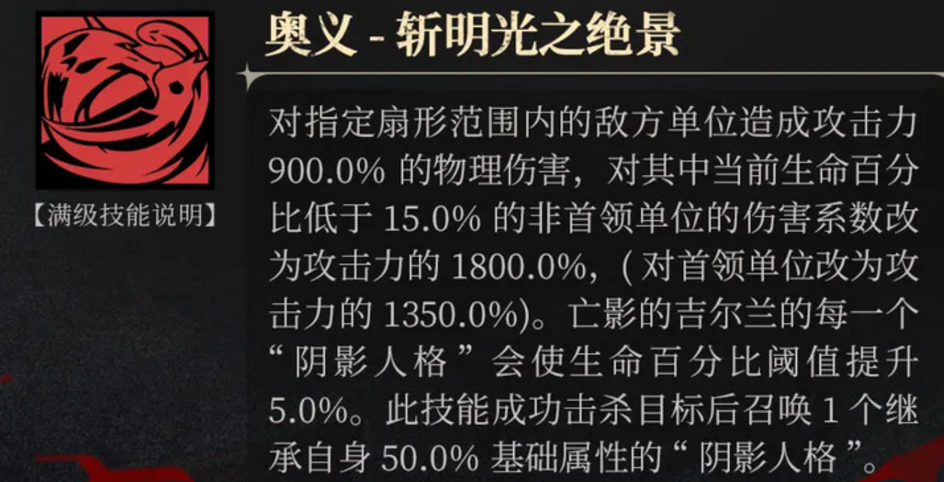 斩明光之绝景这个技能可以对扇形范围内的敌方单位造成攻击力600%的物理伤害,尤其在敌人生命值较低时,这一技能的伤害效果将达到攻击力1200%。这一超高的伤害数值使得吉尔兰在面对血量较低的敌人时,具有强大的击杀能力。