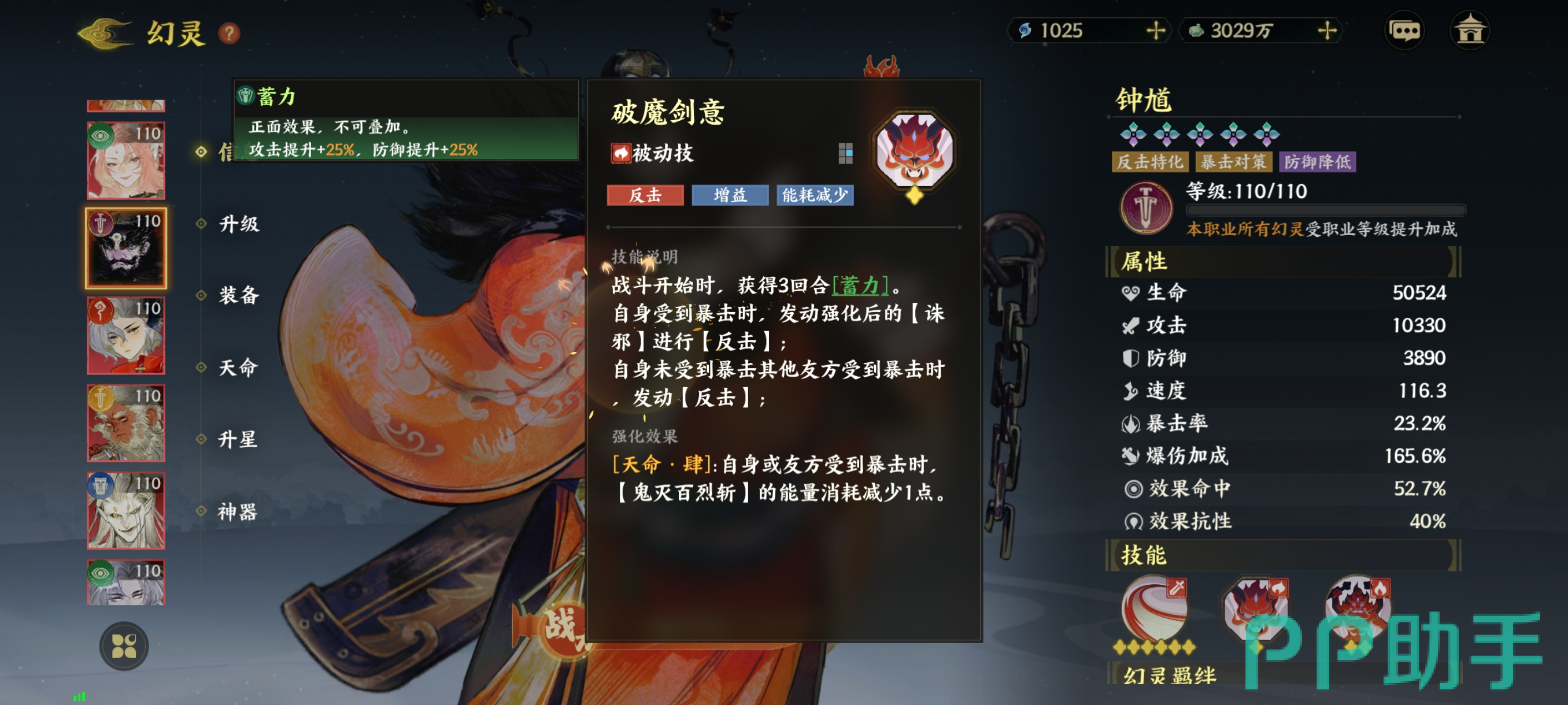 破魔剑意虽然是被动技能,可该技能却有着反击、增加以及能耗减少等特点,战斗开始以后,破魔剑意会自动触发,触发后,钟馗会先获得蓄力效果,蓄力能够提升25%的攻击以及防御,效果可以持续3个回合,当自身受到敌人的暴击伤害以后,子要使用强化以后的诛邪就能进行反击,若自身 没有受到暴击,而队友受到了暴击也能发动反击。