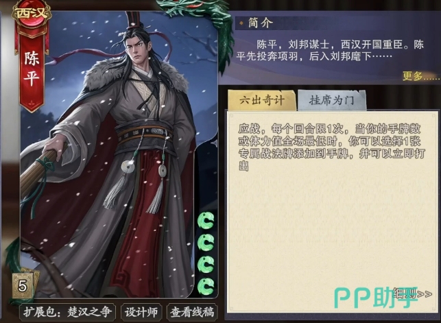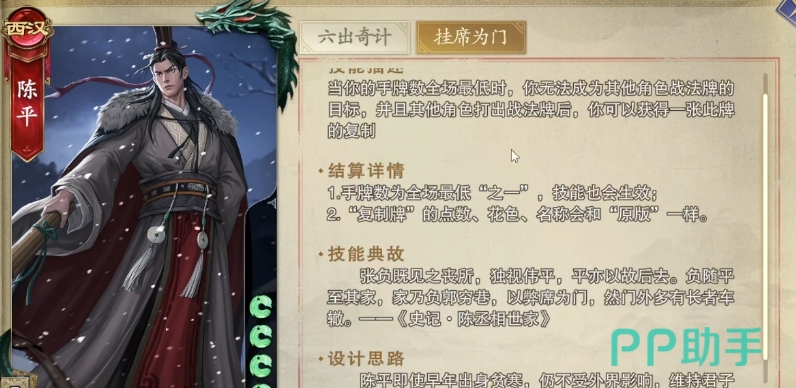 陈平的一技能挂席为门是当陈平的手牌数处于全场最低时,他便能获得防御能力,无法成为其他角色战法牌的目标,而且在其他角色打出战法牌后,陈平还可以获得一张此牌的复制,这一效果让他有机会扩充自己的手牌资源。