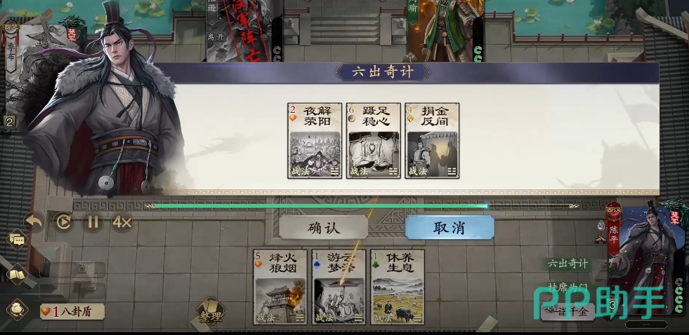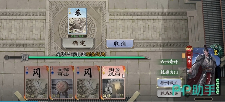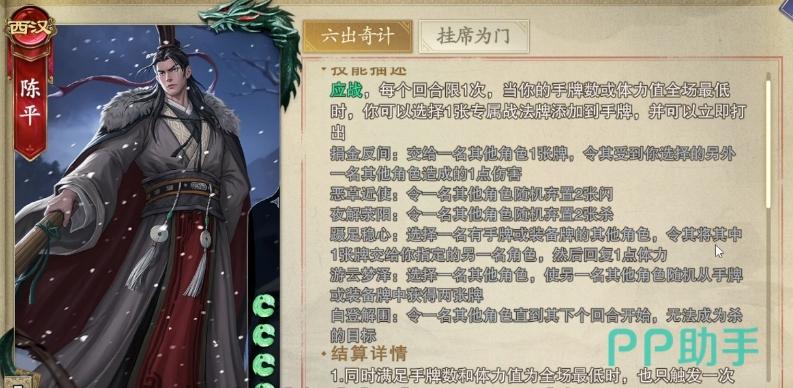 但是陈平在游戏中的实际表现并非如部分玩家所认为的那般不堪,尽管其技能触发条件与手牌上限的问题可能会让一些玩家觉得容易卡手,但实际上挂席为门所带来的收益和防御效果是不可忽视的,手牌数全场最低这一条件,并非是一个难以达成的苛刻要求,而是一种保底的设计,在游戏的进程中,手牌作为一种会被不断消耗的资源,对手牌的合理把控至关重要。当对手的手牌耗尽时,往往会做出更大胆的举动,而陈平在手牌较少时反而能够凭借挂席为门获得优势,复制战法牌扩充手牌,同时即使手牌较多,也不意味着就没有应对之策,关键在于根据局势灵活调整。