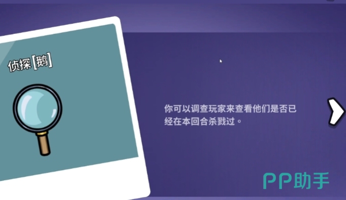 侦探隶属于鹅阵营,是阵营中至关重要的信息获取角色,在这场鹅与鸭的对抗中,鹅阵营需完成任务或揪出所有鸭及带刀中立来获取胜利,而侦探的技能就如同为鹅阵营点亮一盏明灯,帮助大家看清隐藏在暗处的敌人,侦探的核心技能是查验玩家是否在当前轮次杀过人,靠近目标玩家使用技能后,若该玩家当轮尚未出刀,其名字前会显示白色小鸭子脸图标,若已在本轮动过刀,则会出现红色鸭子脸图标。