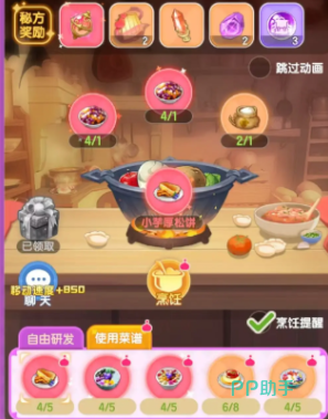 小芋厚松饼:从界面就可以看出,玩家就需要准备对应的材料,只需要根据烹饪的界面去准备即可,在烹饪之后就能迅速的获得950个好友度,可以有效促进与社交。