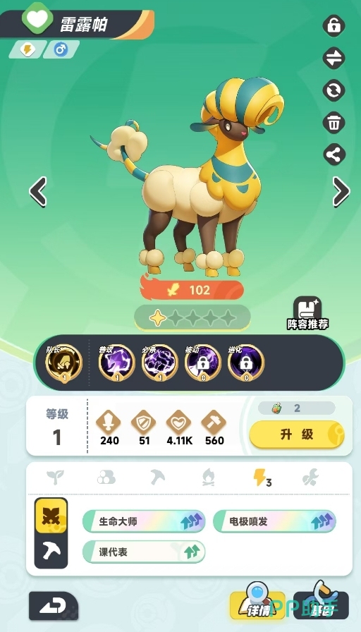 雷露帕是电系队刚需的回能量辅助,它的技能都有着可进行能量回复的特性,覆盖率也很不错,在实战中可频繁地让同队的电系宠物开出大招。