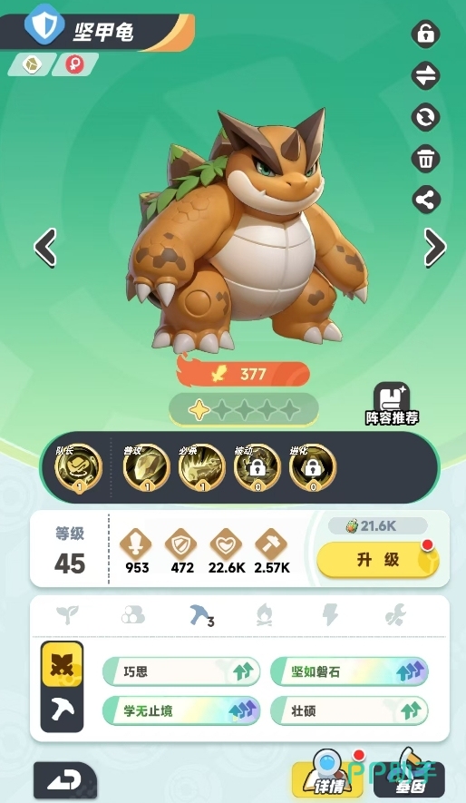 坚甲龟有着极其优秀的身板数值,通常会在岩队中承担坦克位,自身在攻击时还能提高一定的控制效果,在面对一些需要将主力宠放在前排的队伍时能产生很不错的克制效果。