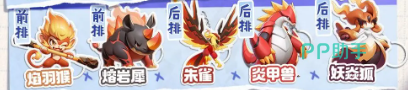 谈起游戏中好用的阵容,要和大家介绍的是游戏中的火系阵容,也被称为火队,这阵容是由焰羽猴、朱雀、妖焱狐、炎甲兽、熔岩犀组成的,这套阵容中核心角色为焰羽猴、朱雀,它们两个是双c。