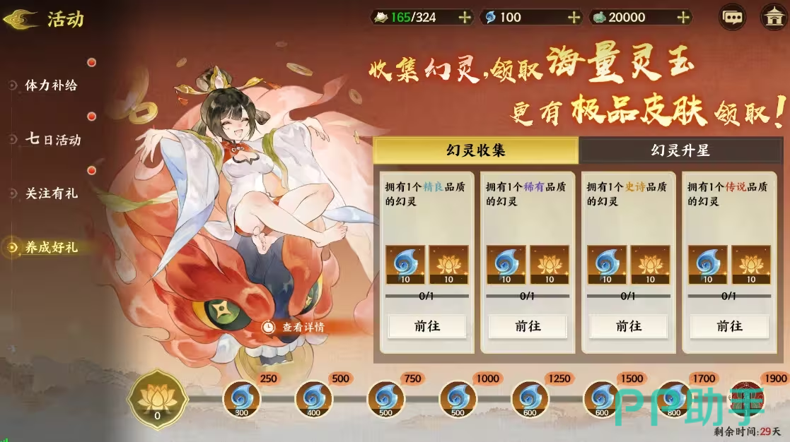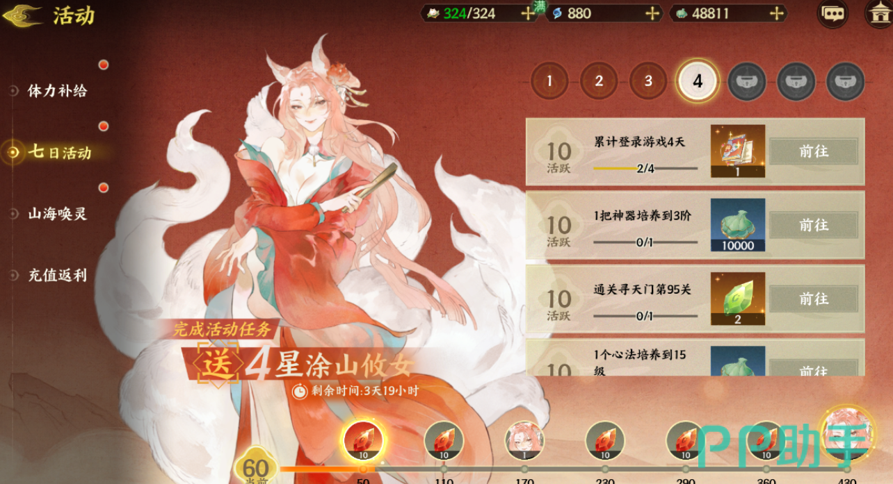 七日活动玩家只要把每天的活动全都完成就能获得4星传说级别的幻灵涂山攸女,涂山攸女虽然是控制型辅助幻灵,可是它的能力却极为的强大,战斗中的涂山攸女有着群体减速以及减攻的能力,有了这个幻灵,我们推图的速度会直接翻倍。
