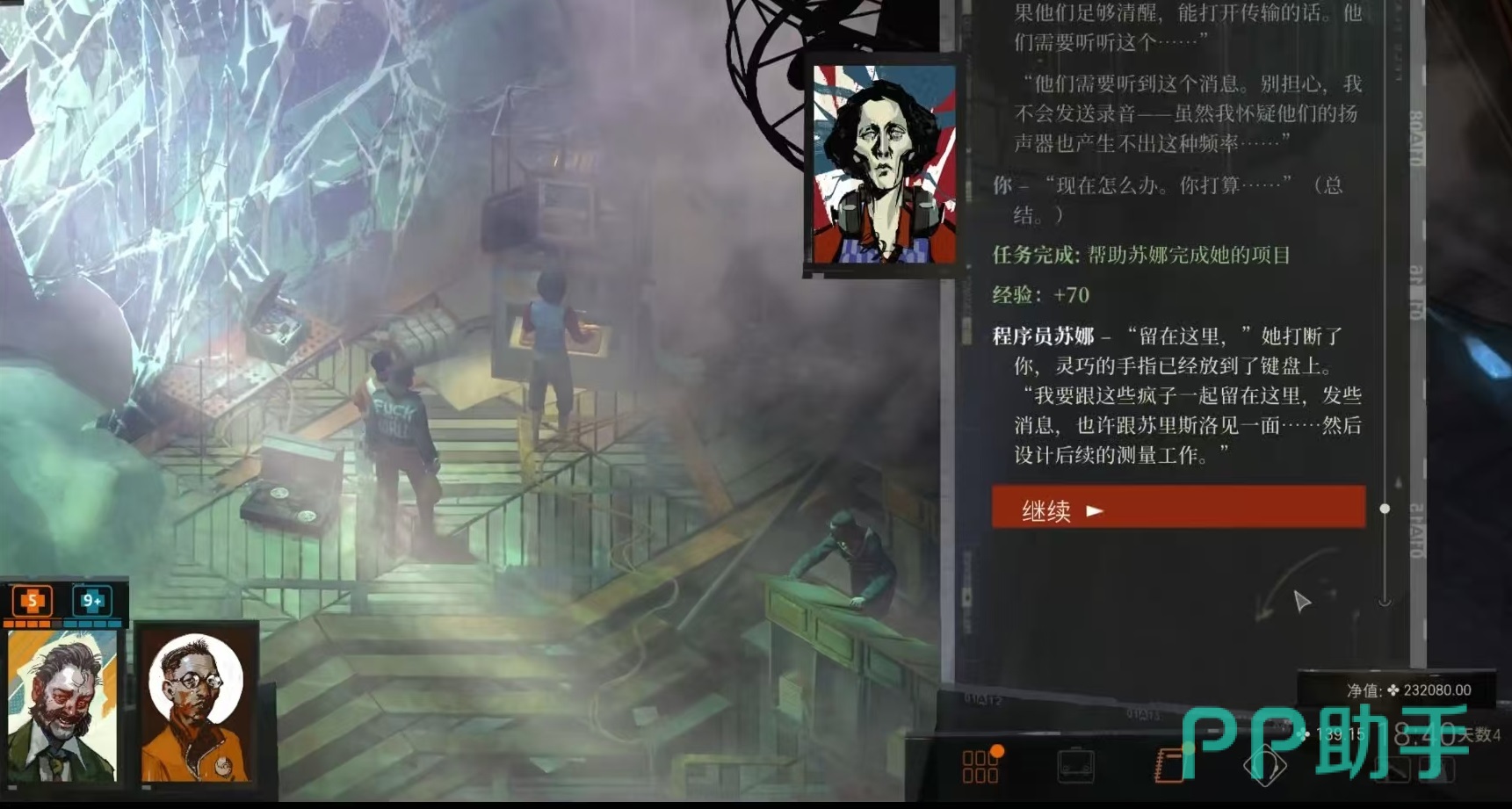 第2个选择如果你不用离开和安德烈谈,他希望你能和平共处,后续通过通情达理-10的检定,可以说服苏娜和派对狂合作。接下来还能获得任务,帮助苏娜完成他的项目以及获得一个工具库瓦桑德KR+2多用工具。因为这些选择会影响任务的走向和后续剧情,如果大家帮助苏娜完成了项目,那么接下来的一些任务会降低难度。