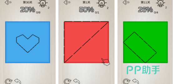 极其简单的操作方式,在设计时和其他的折纸游戏完全不同,采用的是二维拼图以及三维折纸的结合。此游戏特别考验玩家的逻辑思维能力以及想象力,每个关卡中都有不同的卡通图案。根据其中的要求和任务折出相应的图案就算完成挑战。这款游戏的操作方式都特别简单,手机屏幕上会有虚拟的虚线,玩家要按照虚线进行折叠,就可快速完成。