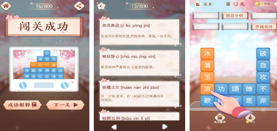 一款融合多种创意玩法的游戏。里面会有成语对对碰还有成语连环猜以及图像联想成语等。会通过循序渐进的闯关形式出现在大家的眼前,里面会有丰富的关卡,而且难度也会逐渐的增加。一旦在成功闯关之后,系统还会给大家带来一些详细的成语介绍,对于玩家而言就能够逐渐的积累知识。让玩家在游戏之余同样还可以提升个人的学习能力。