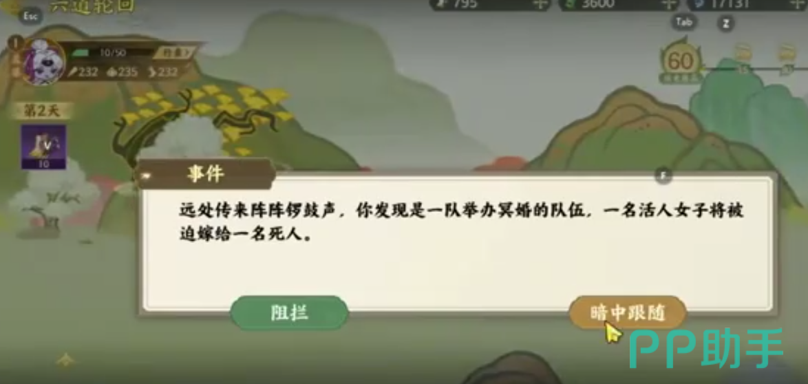 等到了第四十七天的时候,会出现一个奈何桥和鬼门的选项,这里选择鬼门,一直走到第五十二天的时候,会触发望乡台事件,这里可以自由选择,等到了第六十天的时候,我们会到六道轮回的最后一站轮回台,到这里这里选择右边就可以通关。