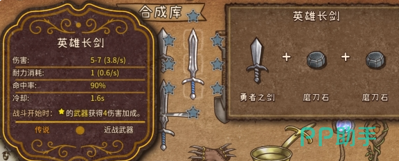 在实用装备方面,勇者之剑就需要两块磨刀石,还有木剑。战斗开始时就可以给武器带来两点伤害加成。进阶版本英雄常见就需要额外的获得两块磨刀石,加成也能有效提升到4点。两者最终就可以通过合成直接变成神级十字剑。
