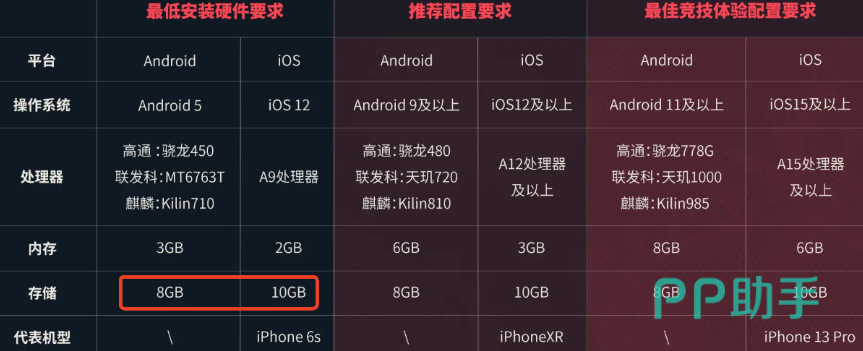 官方给出了三档配置要求:最低安装硬件、推荐配置与最佳竞技体验配置。只要设备满足最低配置要求即可成功安装并运行游戏。安卓端,最低安卓5.0系统,骁龙450、联发科MT6763T或麒麟710,内存3GB,存储空间预留8GB即可。iOS端则是A9芯片,2GB内存,10GB储存。