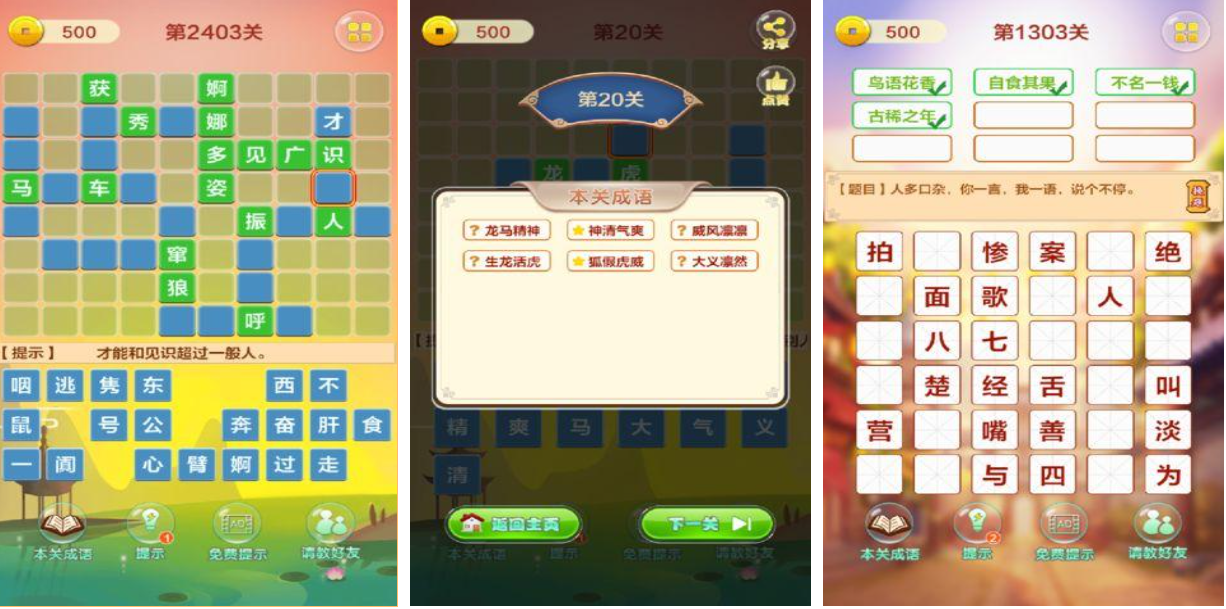 本作是专为小学生玩家开发的成语学习类游戏,成语填字、成语解谜等教育类元素应有尽有,玩家将在一个个关卡中跟传统的成语进行互动,持续不断更新的关卡教导玩家学习了更多的成语,超前的互动操作跟解谜机制搭配可玩性更高,游戏中的提示功能更加完善能轻松度过不同关卡,成语爱好者和小学生玩家都来试试本作吧。