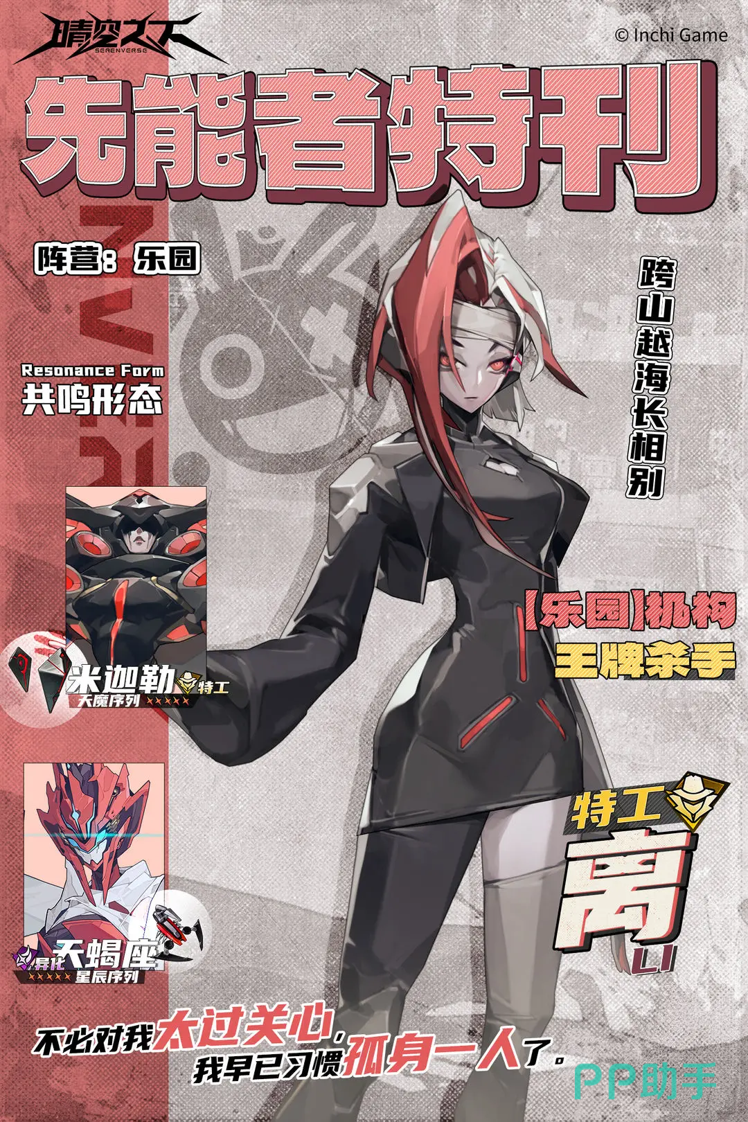 离是乐园阵营的王牌杀手,年幼时经历了绑架案,被劫入乐园当中作为培养对象,经过严苛的训练后成为顶级杀手。作战定位是特工,异能伤害强大,擅长对单体敌人施加强力的打击效果。人形态的1技能“声生寂灭”,能在对敌方打出一定固伤后,再次对目标附加大量伤害。2技能则是将愤怒转化成能量,每当队友遭受伤害时,都会给她提供能叠加的攻击提升效果。3技能“骇怖之姿”,选定目标后,她会对周围所有的敌方单位打出的伤害提升。