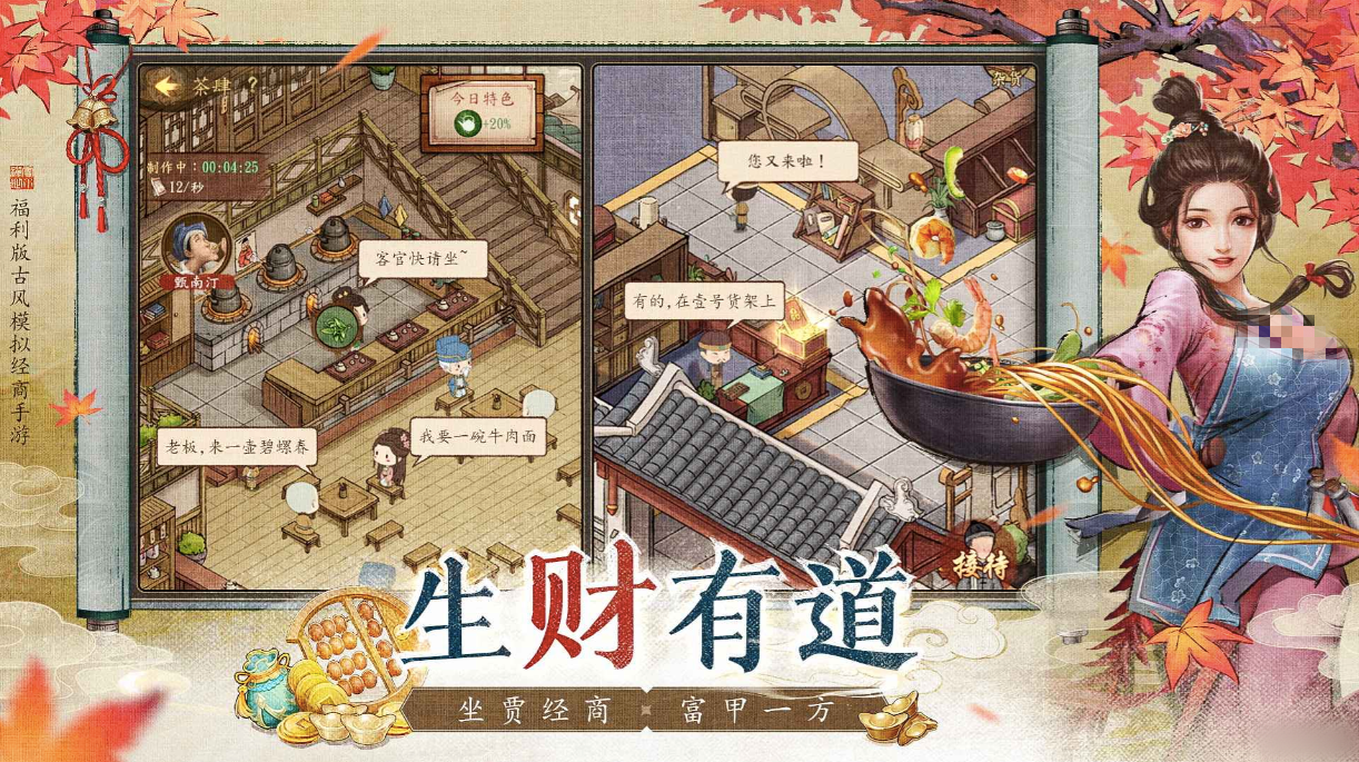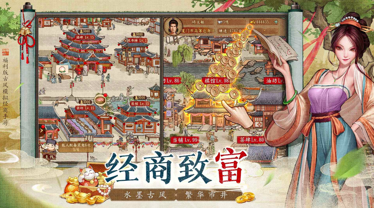 除了这些还可以招纳闲事,如招揽生意的店小二,算计能力超凡的秀才,管理能力非常好的老掌柜,帮助玩家一起经营店铺,无论是做店经商。还是组织商队游走四方,都为玩家带来不可估量的财富。