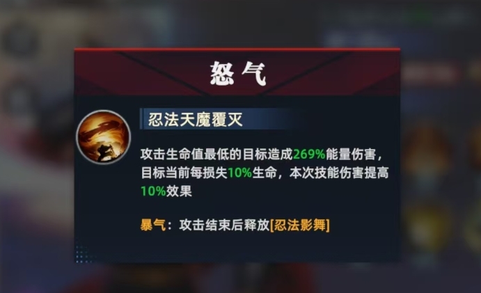 怒气技能则是服部半藏斩杀敌方生命值较低单位的利器,它能够迅速锁定敌方生命值最低的目标,并释放出高额的能量伤害,更为关键的是这一技能的伤害会随着目标当前生命值的降低而进一步升高,形成了一种完美的斩杀机制,也就是说当敌人的生命值岌岌可危时,服部半藏的怒气技能便成为了最后的一击,而在爆气的强化下,怒气技能在攻击结束后还会释放忍法影舞,这一额外的效果能够对敌人造成进一步的打击。