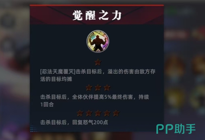 在觉醒之力的加持下,服部半藏的怒气技能也会有变化,如果使用技能后输出还有一定的溢出数值,就会分摊给敌方目前存活的敌人身上,这一机制解决了战斗中常见的伤害溢出问题,使得服部半藏的每一个攻击都能够最大限度地对敌人造成伤害,同时只要成功击杀目标,服部半藏的队友们便能够提高5%的最终伤害。