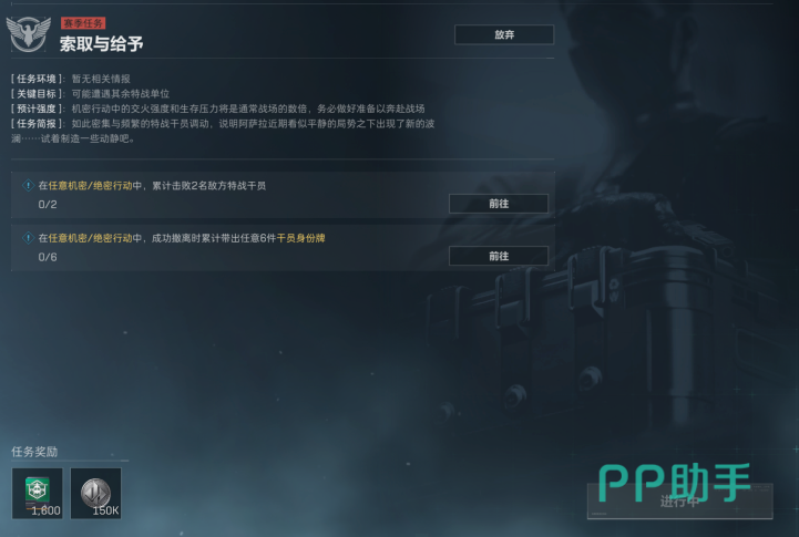 第二个改动的任务是索取与给予。这个任务需要玩家自己杀两个人,并且还需要带出6个狗牌。这里面可以让队友进入之后直接撤,这个任务最大的改动不是提交而是需要带出,这点对于不少玩家来说都比较麻烦。