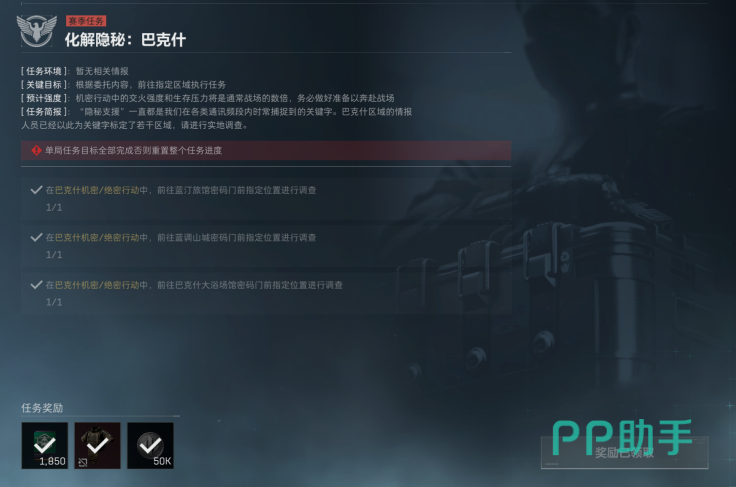 接下来便是化解隐秘巴克什,这个狗牌任务也算是改简单了,我们需要调查三个密码门,因为这次三个密码门的位置都在比较安全的区域。所以我们是可以一口气直接做完。