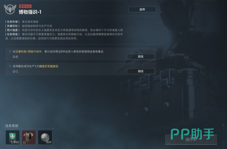 首先第一个狗牌任务改动是博物强识1,这个任务变动为在任意的机密行动或者是绝密行动中需要累计成功带出6件品质大于紫色的家居物品收集品,这个任务比较看玩家的人品,但总体难度并不算很高,另一个是需要生产精密护甲维修包,这个玩家们可以在任务之前提前准备好材料,然后直接搓出5级甲修。