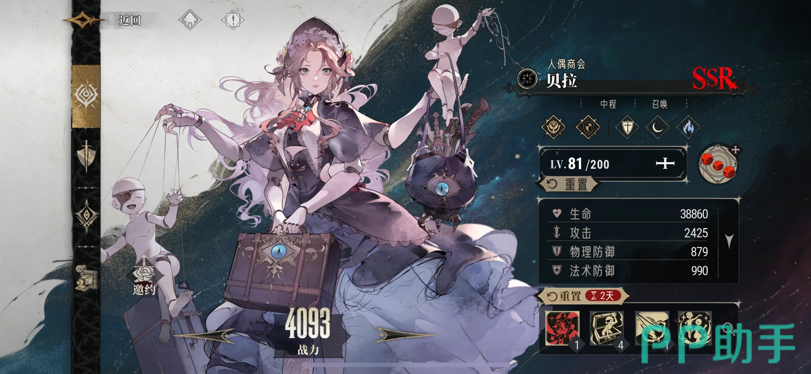 贝拉的基本攻击能对敌方造成不错的伤害,特性的主要效果可对召唤物施加自身最大生命值的治疗效果;战技能够召唤出继承她自己攻击力和防御能力的提线木偶,木偶可以代替贝拉成为主要的承伤对象;奥义技能通过召唤物对所有敌方单位造成高额的群体伤害,并对敌方施加眩晕的效果,还会将敌人的主目标修改为召唤物,会优先对召唤物进行攻击。