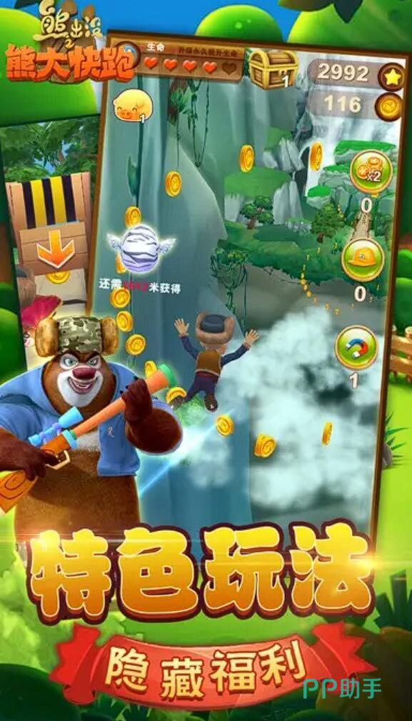 作为一款跑酷游戏,玩家需要帮助熊大、熊二甚至是光头强,完成跑酷挑战。跳跃蘑菇阵、滑下悬崖,操作简单但挑战十足,游戏还原了动画原版配音和场景,并加入了换装系统,可以解锁美熊王、功夫熊大、太空熊等多种趣味造型,每个角色都有不同的技能属性,如功夫熊大可以增加吸铁石时间,而太空熊则能免费复活一次关卡设计丰富,包括普通跑酷和BOSS战模式,玩家需要灵活操作才能顺利通关。
