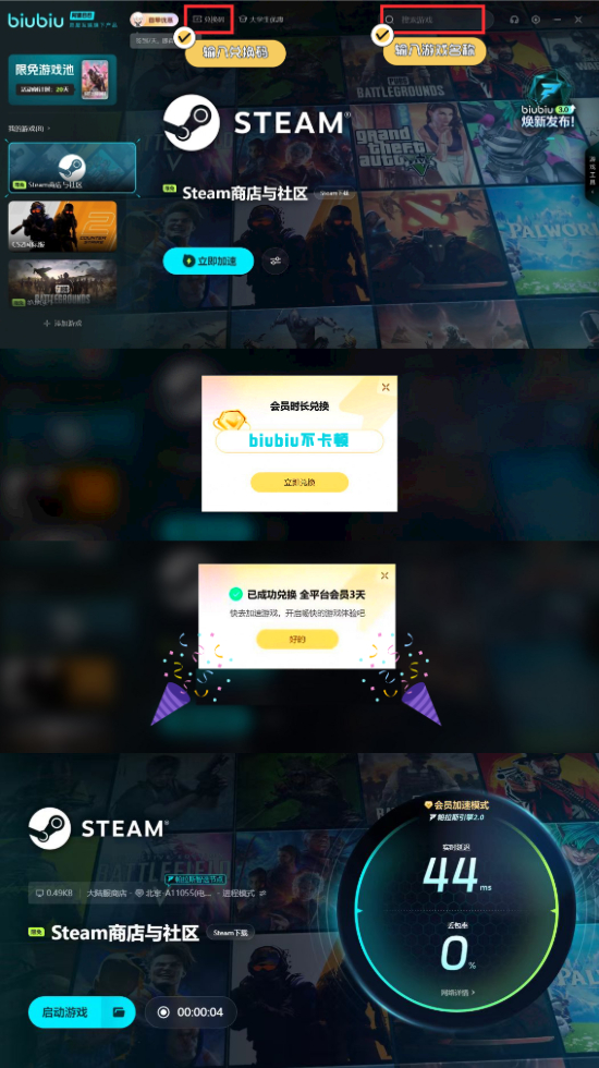首次下载biubiu加速器的新用户将自动获得24小时的免费加速时长,使用体验更轻松。如果在加速器内输入兑换码“biubiu不卡顿”,还可以再领取额外3天加速服务,福利叠加,机会难得。