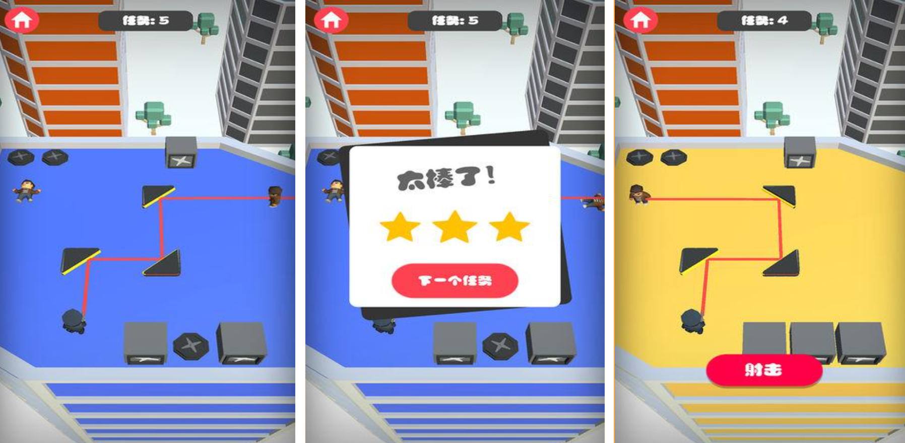 《瞄准射击》是一款将极简风格发挥到极致的2D射击游戏,画面黑白为主,子弹与瞄准线采用亮色高对比设计,最大程度降低干扰,提高射击专注度。简约界面中,敌人通常以几何图形形式出现,但配合射击动画与破碎效果,仍营造出相当强的打击快感。游戏玩法围绕“定点瞄准”展开,玩家需点击或按住屏幕控制武器方向与力度,发射子弹击败关卡中所有敌人。子弹飞行会受到障碍物、风向、重力等影响,必须合理规划路径才能一击致命。随着关卡提升,敌人开始具有反击能力或隐身特性,玩家需要依赖地图地形进行战术掩护,提升战术深度。