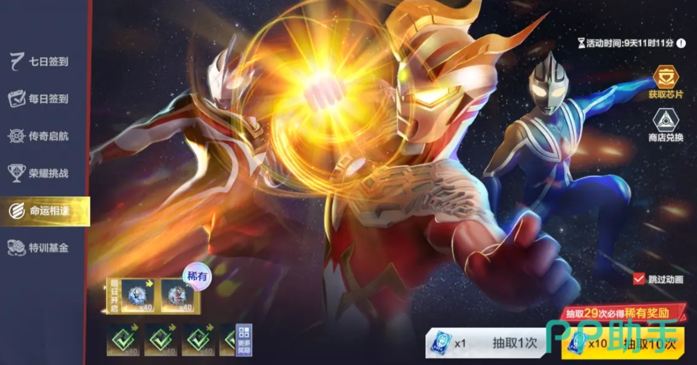 命运相逢作为游戏中招募活动,玩家可凭借在七日活动中辛勤积攒的招募券,在卡池中抽奥特曼,不过需要注意的是,卡池招募的角色会按照天数依次解锁,这种设计增加了招募的期待感与神秘感,同时招募每四十次便会触发保底机制,确保玩家在一定的投入后能够获得心仪的角色或道具,而招募过程中获取的券,还能在命运商城中兑换各种实用道具,其中部分道具每日都会进行刷新,例如每日刷新的四个贝利亚邪能原质,建议玩家优先将其换取。