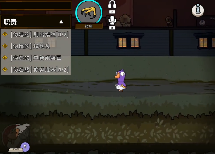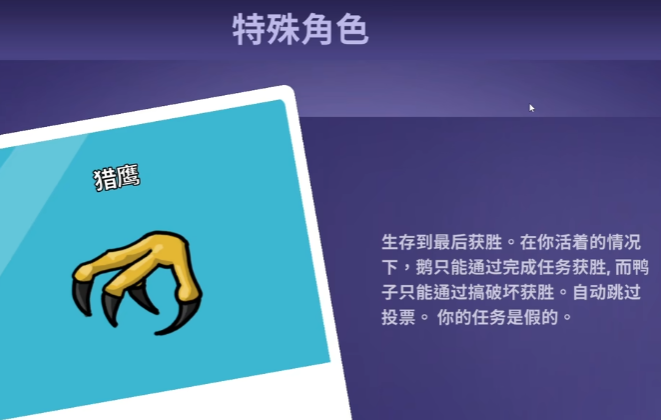 猎鹰归属于中立阵营,这意味着它既不与代表正义的鹅阵营并肩作战,也不与心怀叵测的鸭阵营同流合污,而是凭借自身能力,为达成独立的胜利条件而周旋于各方之间,其在游戏中的独特地位,使得它的每一步行动,都可能改变整个游戏的走向,猎鹰的胜利条件需存活至游戏最后阶段,并成功击败剩余所有玩家,当游戏进程推进到场上仅剩下三名玩家时,将触发狩猎猎鹰的特殊倒计时,此时猎鹰需在倒计时结束前,将另外两名玩家击杀,方能获得最终胜利。
